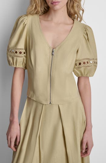 Airy, loopy lace sweetens the style story of this linen-blend top that zips up your casual sunny-day look.