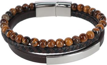 - Features a brown beaded strand, light and dark brown braided strand, and a solid brown strand adorned with a stainless-steel rectangle