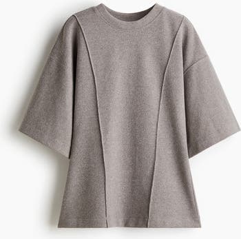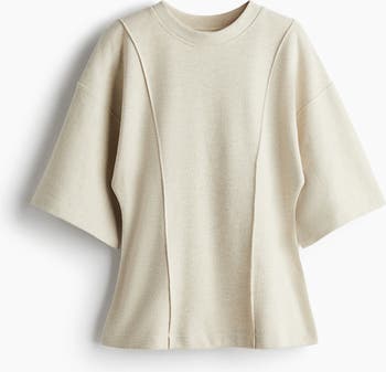 Loose-fit top in a fine knit with a crew neck, visible seams down the front, dropped shoulders and wide, elbow-length sleeves. Gently flared hem.