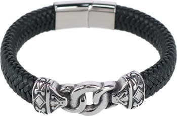 - Features a Celtic silver interlocked design pattern with black woven leather