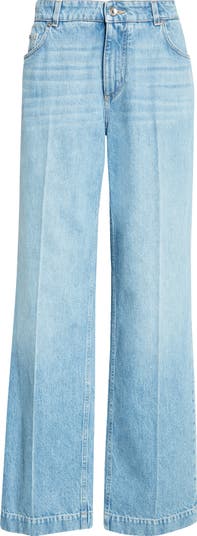 A logo-engraved plaque brands the back pocket of relaxed-fit, low-rise jeans made in Italy from nonstretch denim with pressed creases detailing the straight-leg silhouette.