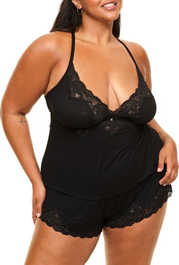 This sleepwear set comes in a ribbed knit fabrication with lace triangle cups, cut-away lace detailing, and a fully adjustable crisscross back. The matching shorts have an easy elastic waistband and make this the perfect PJ set to lounge around in.