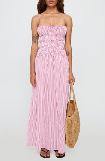 Sweet smocking shapes the bodice of this square-neck sleeveless maxi covered in cheerful stripes and cut from breezy cotton.