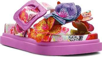 Sparkling floral appliqués blossom on this two-strap sandal that adds a pop of color to your everyday style.