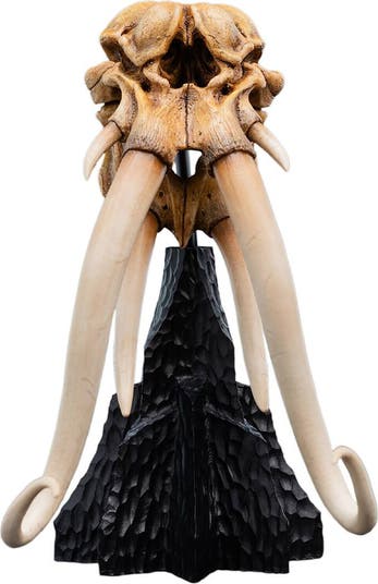 Weta Workshop was intrinsically involved in the design and physical effects manufacture for all three films of The Lord of the Rings™ trilogy. It takes hundreds of hours to design, sculpt, model make, mold, and paint the prototype for each new Middle-earth piece. Whether it be a prop replica, beautiful environment, or iconic character, we treat our collectibles with the same level of care and attention to detail that we bring to our film work. Creatures of colossal scale and ancient lineage, this mûmak skull specimen, though reduced in size through arcane means, retains the historic and anatomical grandeur of its source. Immense curved tusks erupt from a broad, forward-jutting maxilla, while the domed cranial cavity suggests the mass and muscle required to support such weight and fury. Evidence of dense, reinforced bones along the frontal and nasal regions implies evolutionary reinforcement, well-suited for carving through terrain and enemy alike. This piece offers a rare link to the last living echoes of a darker age, where even the wilds of Middle-earth marched to war. Features Made primarily from polystone Approx 5.8 inches tall Based on the mûmakil, from The Lord of the Rings Obsidian-like stand makes this skull feel like an artifact straight out of Saruman’s study Physically sculpted by Weta Workshop Senior Sculptor and Middle-earth veteran Jamie Beswarick “Our authentic prop replicas and collectibles are designed by the very same artists who have worked on the three films, so effectively the come straight from Middle-earth.” - Richard Taylor – CEO and Co-founder, Weta Workshop Ages 14-99 Country of origin China * Please note Images are of a pre-production prototype. Each piece is hand painted and some variations may occur.