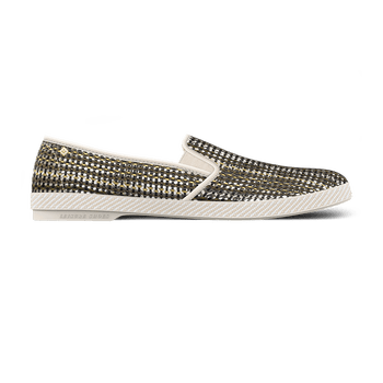 Moccasin in openwork woven fabric . Openwork woven fabric . Rivet in gilded metal . Cotton bias . Ease elastics . Removable leather insole . Cotton band around sole . PVC sole Made in Spain Composition . Upper: 65% polyurethane 30% polyetser 5% viscose fabric . Insole: 30% lambskin 40% carbon latex 30% cork . Outsole: 100% PVC Rivieras is committed to more responsible fashion. As part of our traceability project carried out in partnership with Crystal chain, we reveal the origin and manufacturing details of our garments. To find out more, scan the QR code on the label inside the garment.