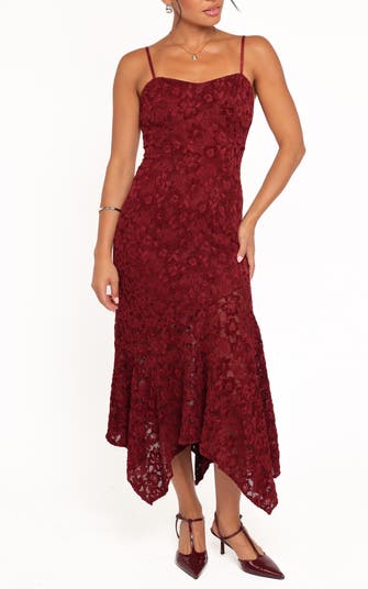 Beautifully detailed embroidered lace defines an alluring dress designed with a handkerchief hemline that's unlined and will elevate every step you take.