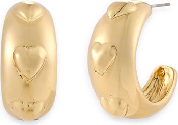 Sculpted hearts are stationed around shiny hoop earrings finished with a goldtone plate.