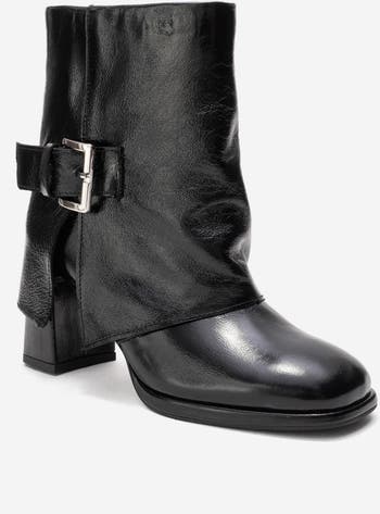 A statement boot that combines draped ankle detailing with a bold buckle for an elevated, modern look