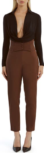 A plunging cowl neckline dares to bare on this stretchy bodysuit topped with a polished spread collar.