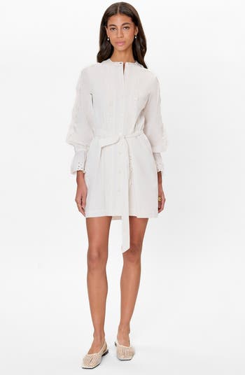 Crafted from soft, breathable cotton, the Lorelai Tunic Dress blends everyday ease with artisanal detail. This button-front silhouette features intricate embroidered eyelet trim framed along the placket and sleeves, while a removable self-tie belt allows for personalized shaping at the waist. Gently flared sleeves with elasticated cuffs add a feminine finish, creating a polished yet effortless piece suitable for both casual days and refined occasions.