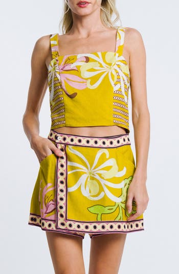Keep the vibes breezy all-day long in this naturally breathable linen-blend top made with a cropped hem and a vacay-inspired print.