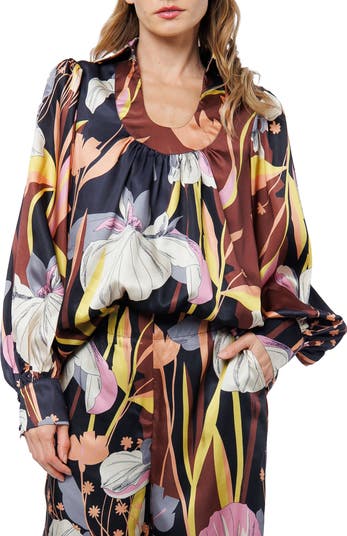 Bold blooms and a graceful flow define a striking top cut from glossy satin.