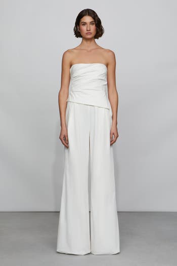 Strapless wide-leg jumpsuit in cotton poplin with an asymmetrical, softly pleated bodice. Clean and minimal—perfect for warm-weather events or modern bridal moments.