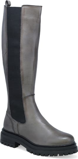 With elastic goring on one side and a zippered closure on the other, this shiny leather boot lifted on a lug sole is easy to put on and comfy to wear.