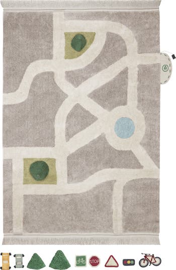 A washable rug crafted from plush cotton lets your child build their own city with stimulating patterns of streets, parks and an aqua-blue fountain. A bag of fun accessories comes with this rug and includes artisanally made cotton cars, trees, traffic signs and a charging place for electric cars.
