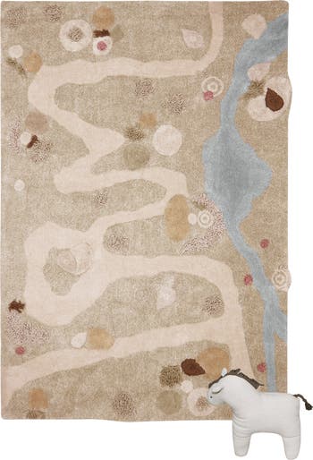 A washable rug crafted from textured cotton lets your child build their own park with stimulating patterns of a river and a strolling path. This rug comes with a plush cotton carry bag and a horse-shaped minicushion.