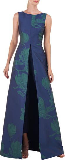 A full skirt overlay lends instant drama to sophisticated jumpsuit completed by slender cropped legs.