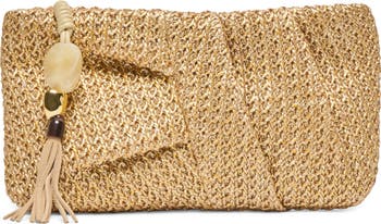 Bring a beachy boho vibe to your date night or party look with compact clutch made of earthy woven raffia and suspended from a removable strap.