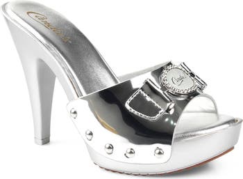 Polished studs and sparkling hardware dial up the drama of this lofty, occasion-ready platform sandal.