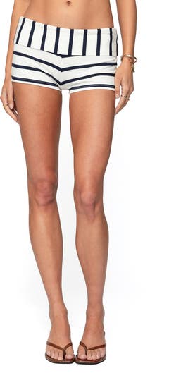 Move in comfort whether you're lounging at home or running weekend errands in these fold-over shorts cut from a stretchy and striped fabric.
