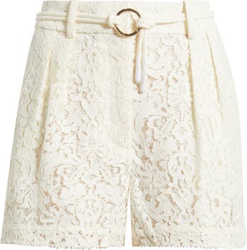 Delicate lace brings a romantic feel to these pleated shorts designed with soft structure. A removable belt defines the waist, while the tailored shape keeps the look polished.