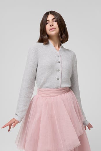 A refined stand-collar cardigan in a sumptuous merino-cashmere blend, featuring soft light pink trim and twinkling star-shaped rhinestone buttons for a subtle, celestial allure.