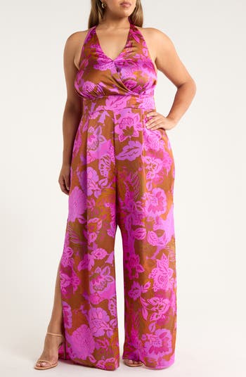 A halter silhouette amplifies the summery vibe of a lustrous, floral-patterned jumpsuit fashioned with wide legs for an on-trend look.