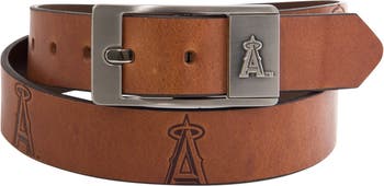 Enjoy a spirited accessory fit for cheering on your favorite team when you grab this Los Angeles Angels brandish leather belt. Featuring embossed team graphics repeated around the belt and an engraved team logo on the metal buckle, this adjustable belt has Los Angeles Angels spirit in spades and won't interfere with your polished personal style.