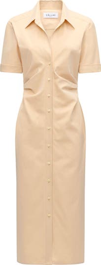 Lou is a button front, short sleeve shirt dress with a fitted sheath silhouette. Tucks at the side seam waist accentuate the fitted shape. The dress is midi length. Lou is made from a soft Italian cotton twill.