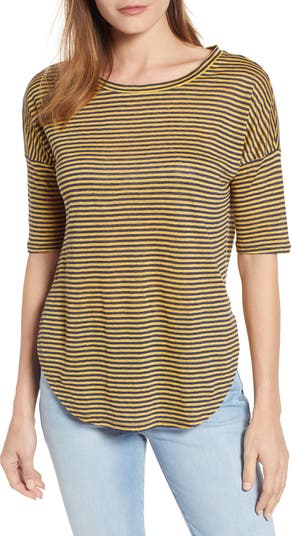 A dramatically curved hemline adds a flattering finishing touch to a classic tee in breezy linen.