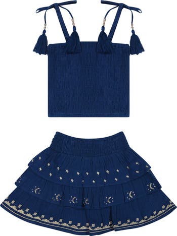The Louisa Girls Top and Skirt Set makes every day a celebration! Featuring a charming smocked shoulder tie top adorned with delicate petal embroidery, paired with a twirly ruffle skirt finished with playful tassels. This set keeps little ones comfortable and ready to dance, making it perfect for parties and sunny adventures.