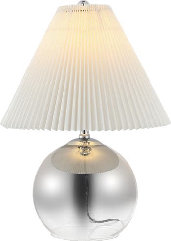 Our chrome table lamp is a minimalistic and elegant addition to any space. Its sleek base is complemented by a soft cotton pleated shade. With a glam design, this mid-century modern style lamp elevates living rooms and entryways alike.