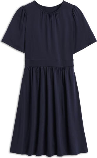 Subtle gathers at the jewel neckline meet soft angel sleeves on this crease-free jersey dress finished with a nipped-in waist and a floaty, knee-grazing skirt.