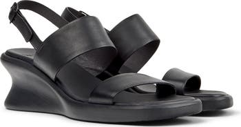 An anatomic footbed and an extralightweight sole ensure flexibility and comfort in a curved wedge sandal topped with a duo of leather straps.