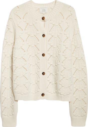 Made in cashmere with an supersoft touch, this cardigan captures attention through a raised seashell stitch that brings depth and gentle texture to a clean straight silhouette. Buttons march down the front and ribbed edges sharpen the line for a piece that feels distinctive yet easy to wear.