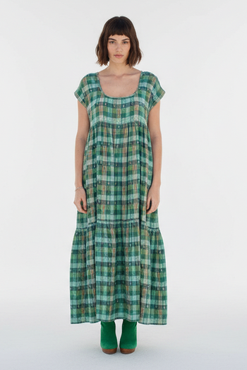 a tiered maxidress with a low scoop neckline and cap sleeves. falls to the ankles.