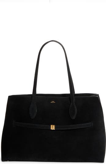 First seen on the runway, this belted tote crafted from velvety Italian suede showcases a spacious interior and slender handles long enough for shoulder carry.