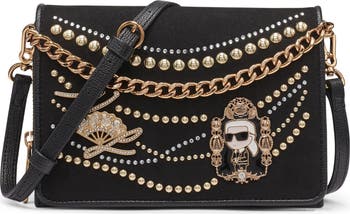The KARL LAGERFELD PARIS Small Lourdes Crossbody redefines playful luxury with its premium leather construction and eye-catching Karl-themed pins. This chic bag pairs classic elegance with bold personality, featuring a sleek silhouette accented by signature hardware and a comfortable strap. Perfect for adding a unique, stylish edge to your everyday look.