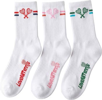 Love All Tennis Socks deliver comfort that matches your game. This three-pack bundle features soft, breathable cotton blended with stretch for flexible support whether you're on court or off. The ribbed construction keeps socks securely in place, while bold red and navy stripes paired with our signature embroidered crossed-heart logo add sporty style. At just $40 for three pairs, you're stocking up on essentials that combine performance with timeless design
