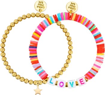 Let your wrist game shine with this little band of awesomeness. This vinyl disc bead and gold-plated bracelet duo is the perfect way to show off some unique style and personality. Made with love in CA from super comfy materials, these children's bracelets are the ultimate accessory for school, playdates, and everything in between. Each kid's bracelet is delicately designed to be mixed, matched, and stacked for endless accessorizing. This item comes pre-packed on a card perfect for gifting.