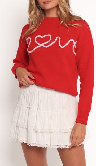 A heartfelt embroidered message loops across the chest of a bright and lightweight crewneck sweater knit in a relaxed profile.