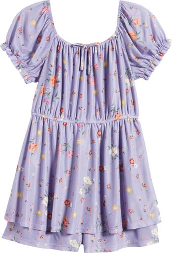 Whimsical flowers shower a sweet romper accented with cute ruffles on the cuffs and a tie detail on the neckline.