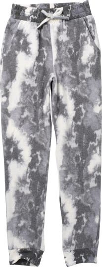 Retro-esque tie dye printing decorates a comfy pair of cozy joggers for an on trend look.