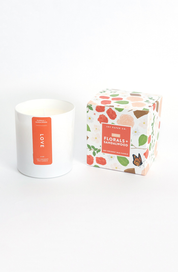 Infuse your space with warmth and romance with our Love (Florals + Sandalwood) Soy Coconut Candle. This 8 oz. candle, housed in a sleek white glass tumbler jar and packaged in an elegantly illustrated box featuring floral and sandalwood-inspired designs, is crafted with a natural soy and coconut wax blend for a clean, long-lasting burn of approximately 72 hours.