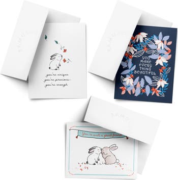 - Card 1 front artwork: Bunny "you're unique, you're precious, you're enough," Blank inside