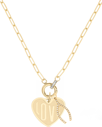 love and luck in a necklace. This necklace features a 16-18" adjustable necklace with a clasp at the front center holding a love heart charm and a pave wishbone charm all made with gold PVD stainless steel coin.