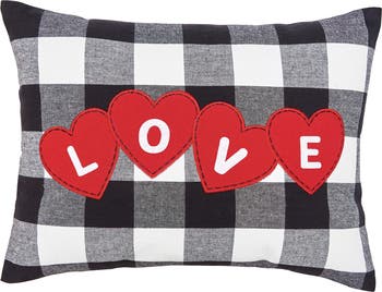 - A classic gingham check pattern and hearts appliqué with homespun style are displayed on the Love Hearts Franklin accent pillow.