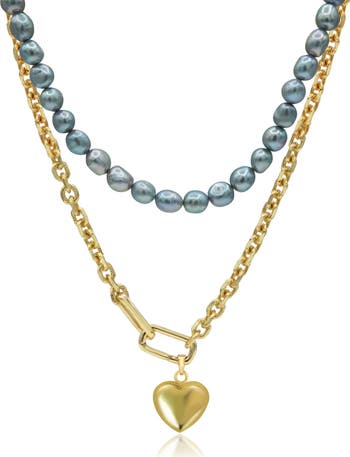 A chunky chain necklace plated in 18-karat gold pairs with a strand of baroque pearls to bring lovely luster and glow to your look.