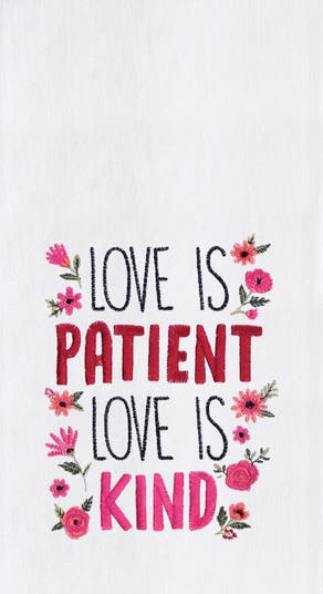 - Features beautifully embroidered flowers in red and pink hues alongside the romantic phrase "Love Is Patient & Kind," creating a charming accent piece that celebrates love and brings warmth to your kitchen with timeless elegance and heartfelt sentiment.